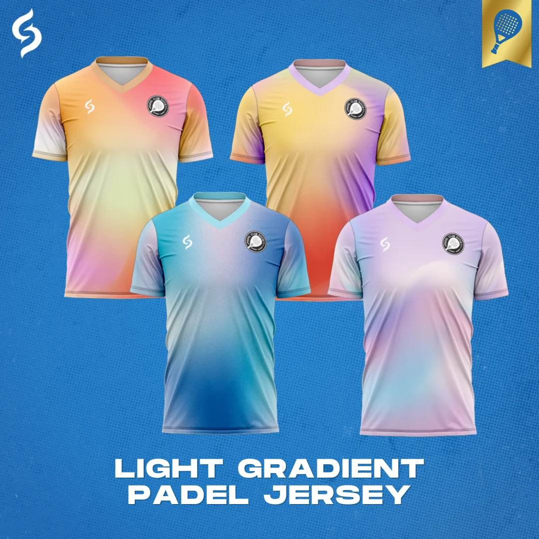 Jersi padel edisi khusus dark gradient series buatan Street Jersey. Bercorak gradasi warna yang cantik sekaligus modern. Versi gelap bisa Anda lihat di sini.